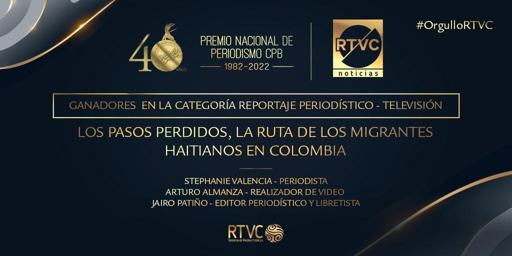 RTVC Sistema de Medios Públicos fue reconocido en la ceremonia de entrega del Premio Nacional de Periodismo CPB 2022, luego de obtener un galardón a través de RTVC Noticias en la categoría Reportaje periodístico para Televisión, por el especial ‘Los pasos perdidos, la ruta de los migrantes haitianos en Colombia’.