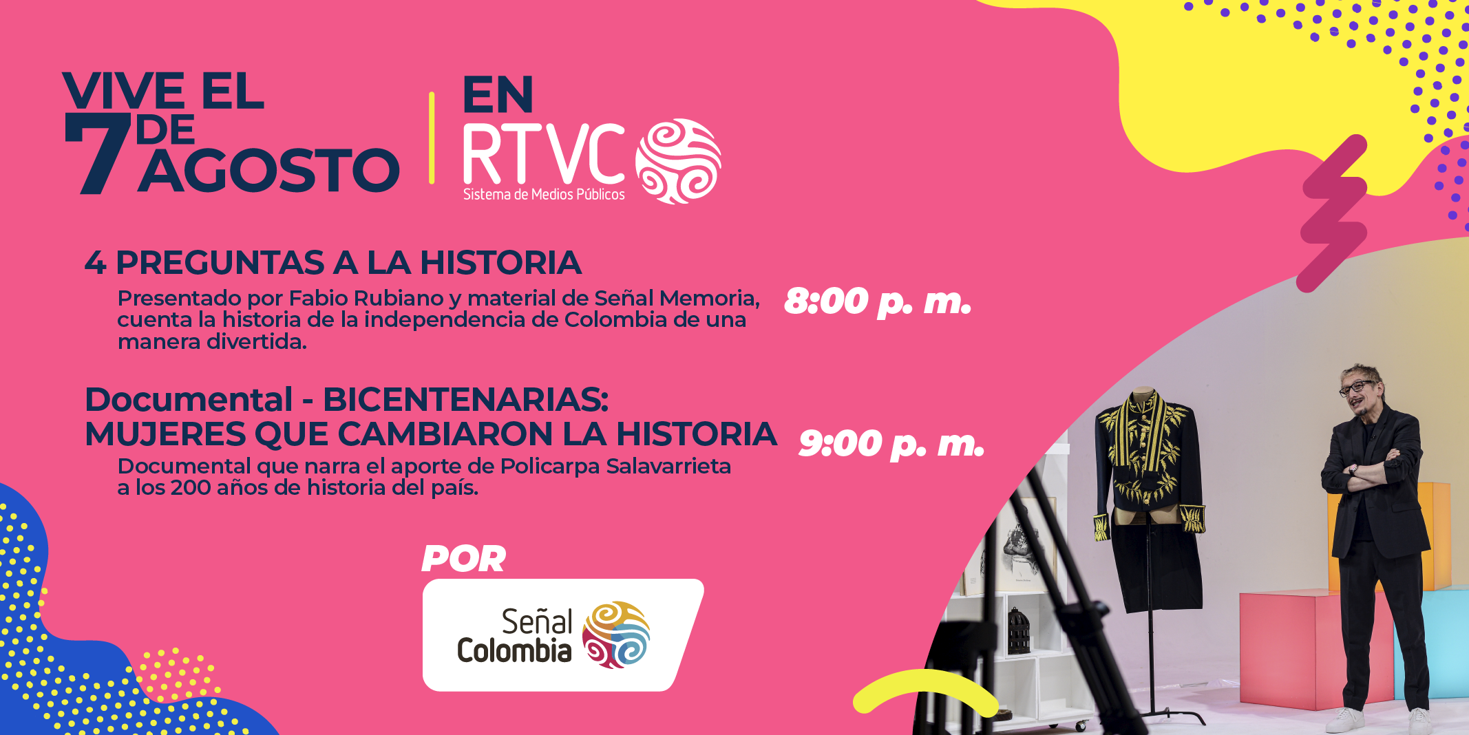 En la pantalla de Señal Colombia podrá ver dos capítulos de la serie 'Bicentenarias, mujeres que cambiaron la historia', con ‘La pola’ y Manuelita Sáenz como protagonistas. De igual manera, como parte de la conmemoración, el canal educativo y cultural tendrá a disposición la película documental “Un Bicentenario de historias”, presentado por Carolina Ramírez; también se estrenará la serie “Cuatro preguntas a la historia”, con la conducción de Fabio Rubiano.
